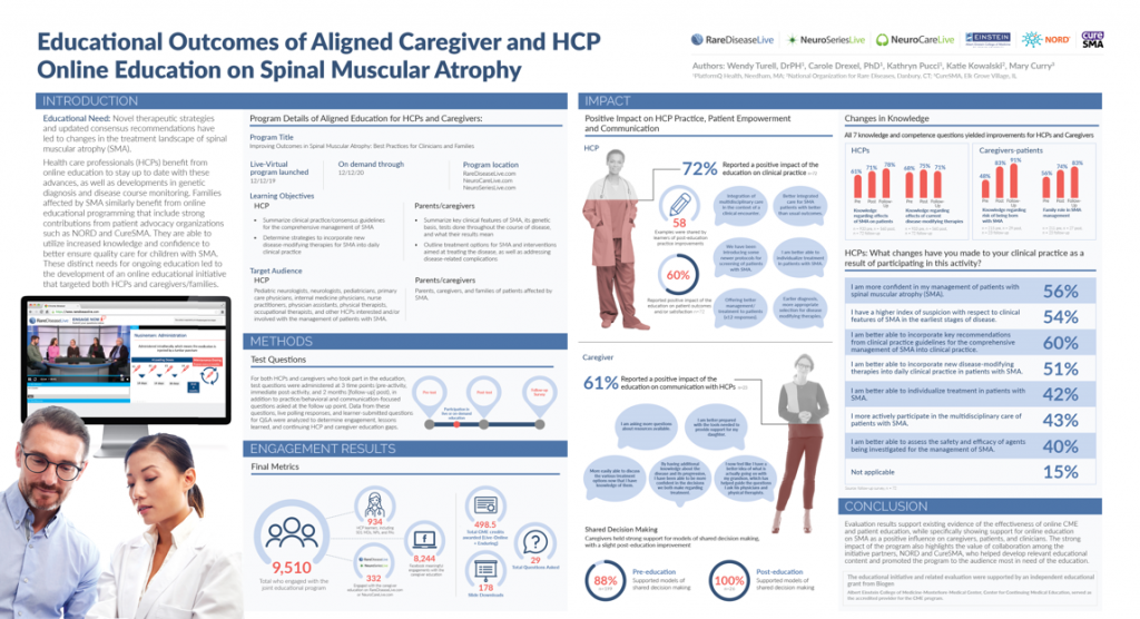The poster, “Educational Outcomes of Aligned Caregiver and HCP Online Education on Spinal Muscular Atrophy” shares the outcomes from an online educational initiative in Spinal Muscular Atrophy, that targeted both HCPs and caregivers. The tethered educational program, “Improving Outcomes in Spinal Muscular Atrophy: Best Practices for Clinicians and Families” was produced in collaboration with the National Organization for Rare Disorders, one of our long-term partners and CureSMA.