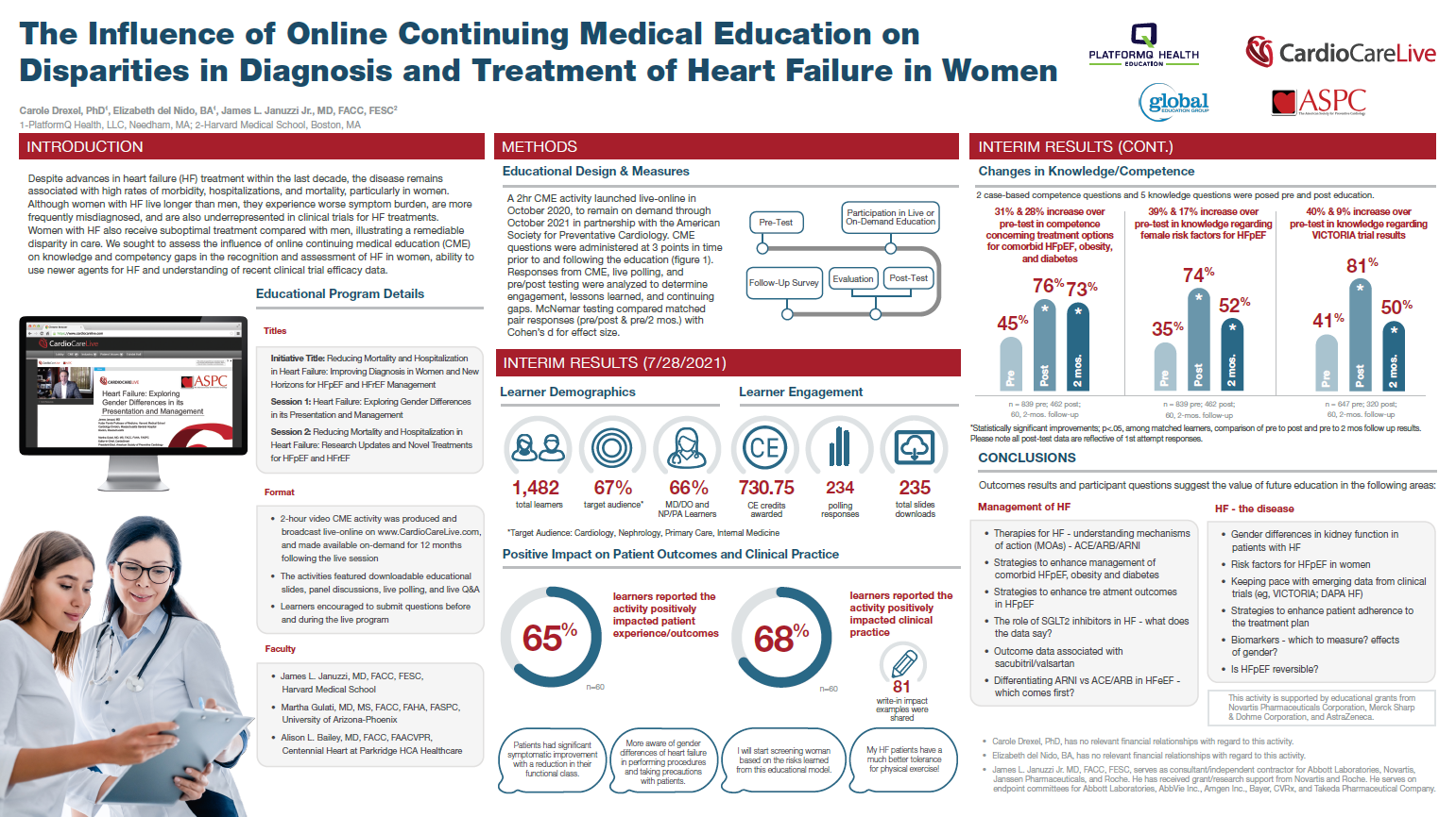 At two months after the course, 65% of learners reported that the education has provided a positive impact on patient outcomes and 68% reported a positive impact on clinical practice. 83 learners also shared qualitative examples of changes in improving the assessment of women with heart failure symptoms as well as the ability to use newer agents in managing the condition.