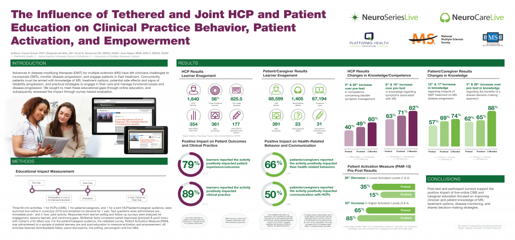 Advances in disease-modifying therapies for multiple sclerosis can improve the quality of life of patients – yet rapid changes to the treatment landscape left knowledge gaps among providers and patients. In addition, for patients to play a role in their own making, they also need to understand treatment options, side effects, side of disability progression, and strategies to manage functional losses. PlatformQ Health sought to meet these knowledge gaps through tethered education.