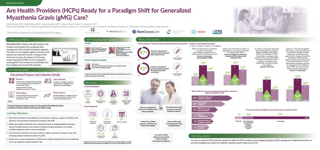 The educational outcomes from this initiative were accepted as a poster at the MGFA Scientific Session at the 2022 American Association of Neuromuscular Electrodiagnostic Medicine Annual Meeting in Nashville, TN to assess the impact of the education on HCPs’ competence in treating mGM in the context of comorbidities and the emerging role of anti-FcRn therapies. The results were impressive: