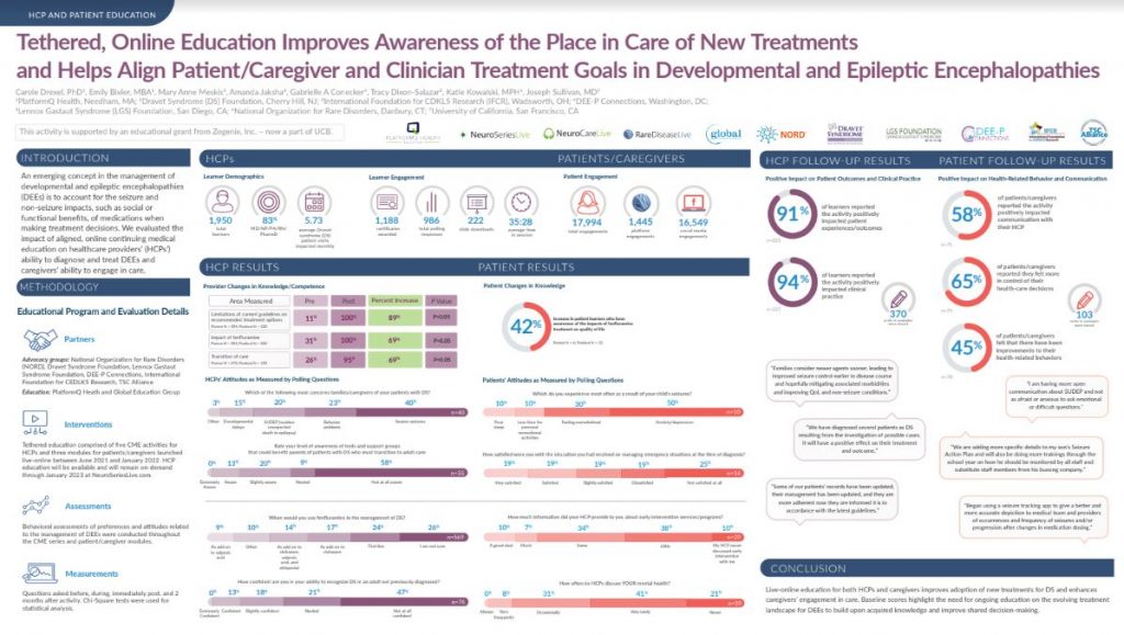 1,950 learners participated in the programs, including 83% of whom were MDs, NPs, PA, RNs, or PharmaD professionals, with an average time in session of more than 35 minutes. Provider changes in knowledge/competence was significant, with learners reporting an 89% increase in understanding the limitations of current guidelines for treatment options, 69% reporting an increase in understanding the impact of fenfluramine, and 69% reporting an increase in understanding transition of care. Patient knowledge was also improved, with a 42% increase in patient learners who became aware of the impacts of fenfluramine treatment on their quality of life.