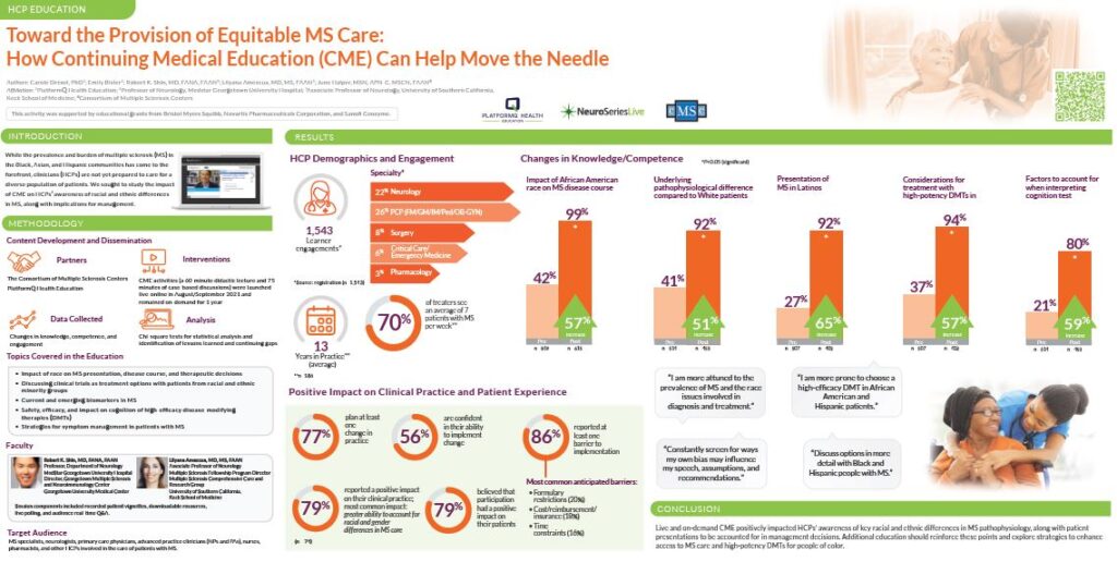 There is a high burden of multiple sclerosis (MS) in the Black, Asian, and Hispanic communities, yet clinicians are often not prepared to care for diverse populations of patients. To address this issue, PlatformQ Health and the Consortium of Multiple Sclerosis Centers partnered to develop CME activities, including a 60-minute lecture and 75-minutes of case-based discussions.