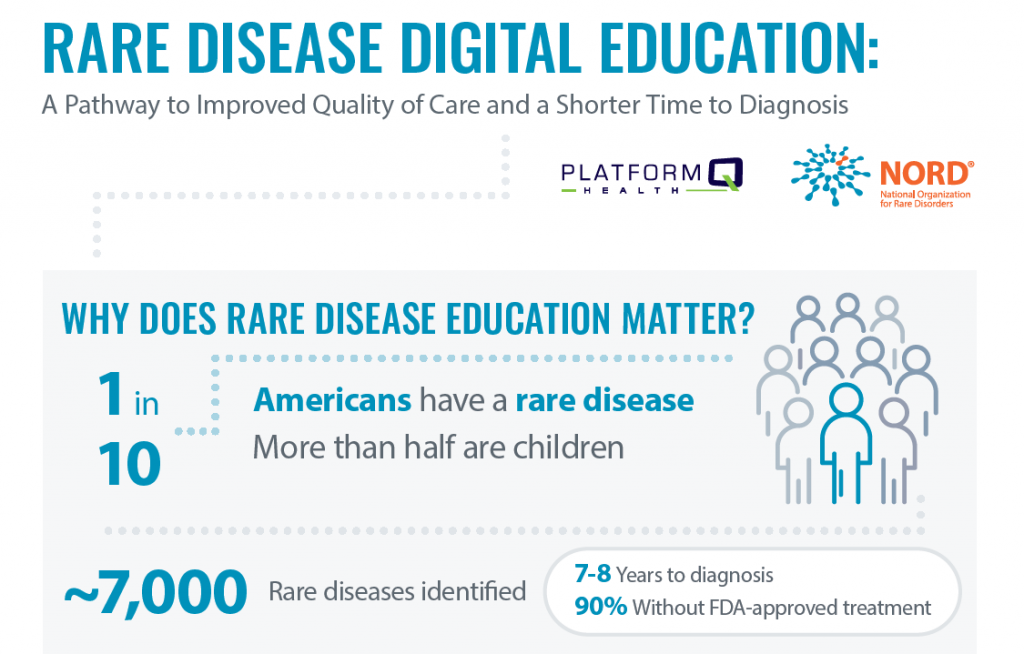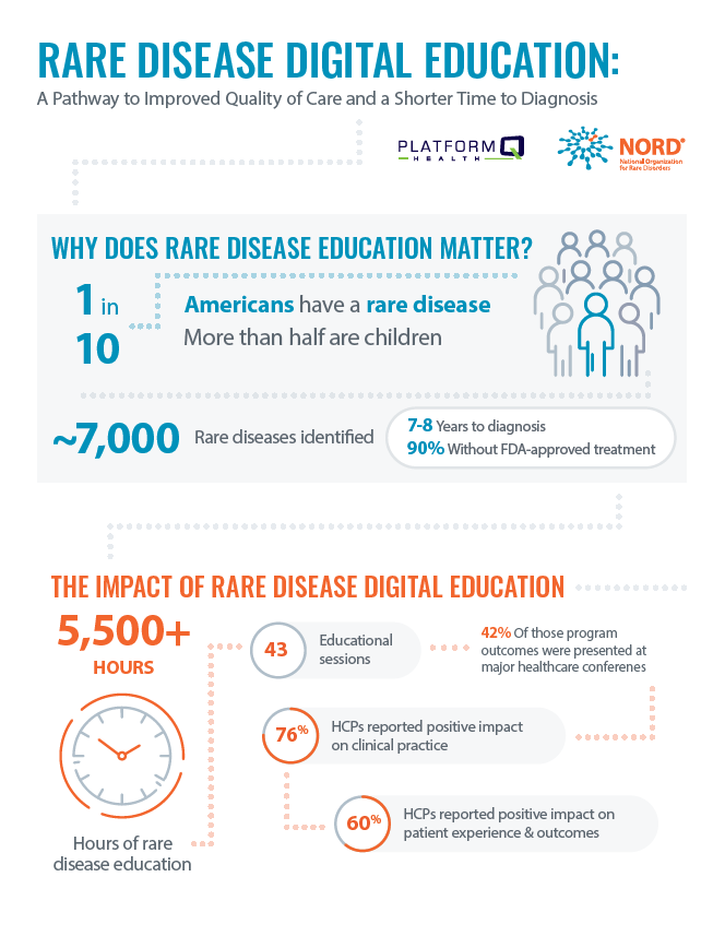 Over the past year, PlatformQ Health and the National Organization for Rare Disorders partnered on an initiative to produce a multitude of rare disease digital education. Through this initiative, PlatformQ Health and NORD developed an extensive rare disease partner network to create a wide range of education covering 29 different rare diseases, conditions and topics. Together, we grew our rare disease education library immensely, with 5,500 hours of education across 43 digital sessions to ultimately improve patient experience, health outcomes and clinical practice. Click here to download your own copy!
