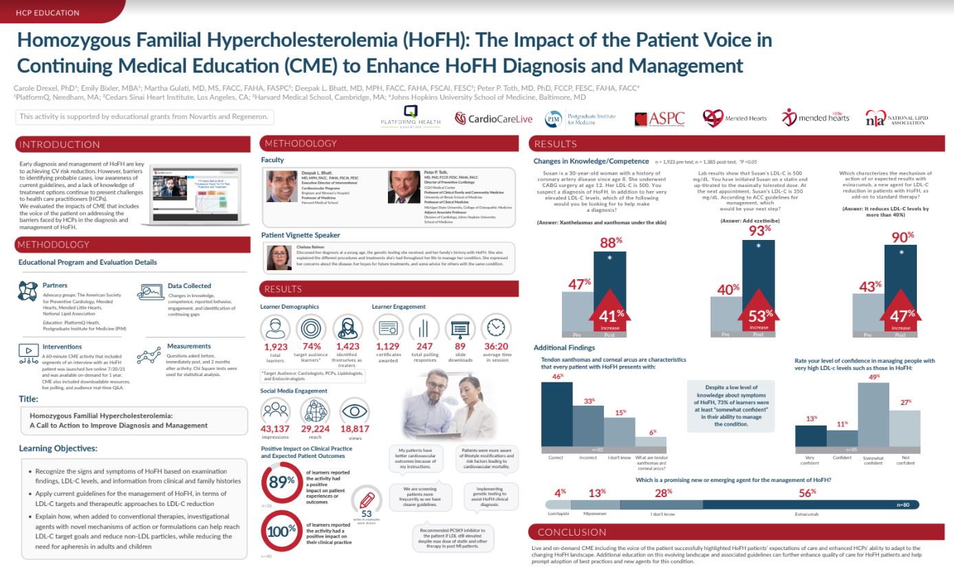 The CME with patient voice successfully highlighted patients’ expectations of care as well as emerging changes in the HoFH landscape. Additional education will be beneficial as new best practices and agents become available for treating this condition.