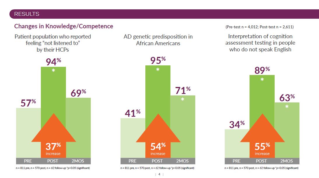 - 54% increase in knowledge about the genetic predisposition African American patients have for Alzheimer’s disease